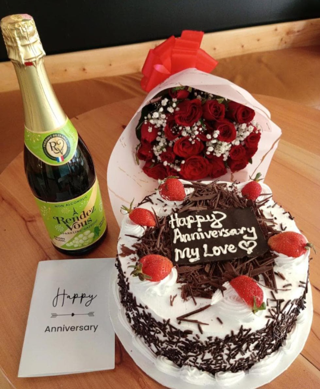 Fresh Flower, 20 roses with baby breath, 1kg black forest cake, non-alcoholic wine, and anniversary card.