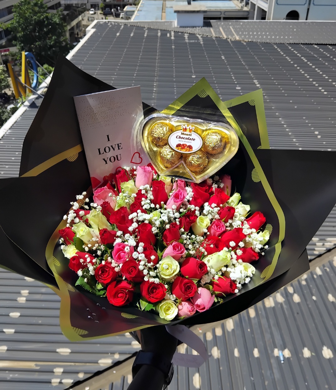 Fresh mixe roses with golden chocolates  and a card.