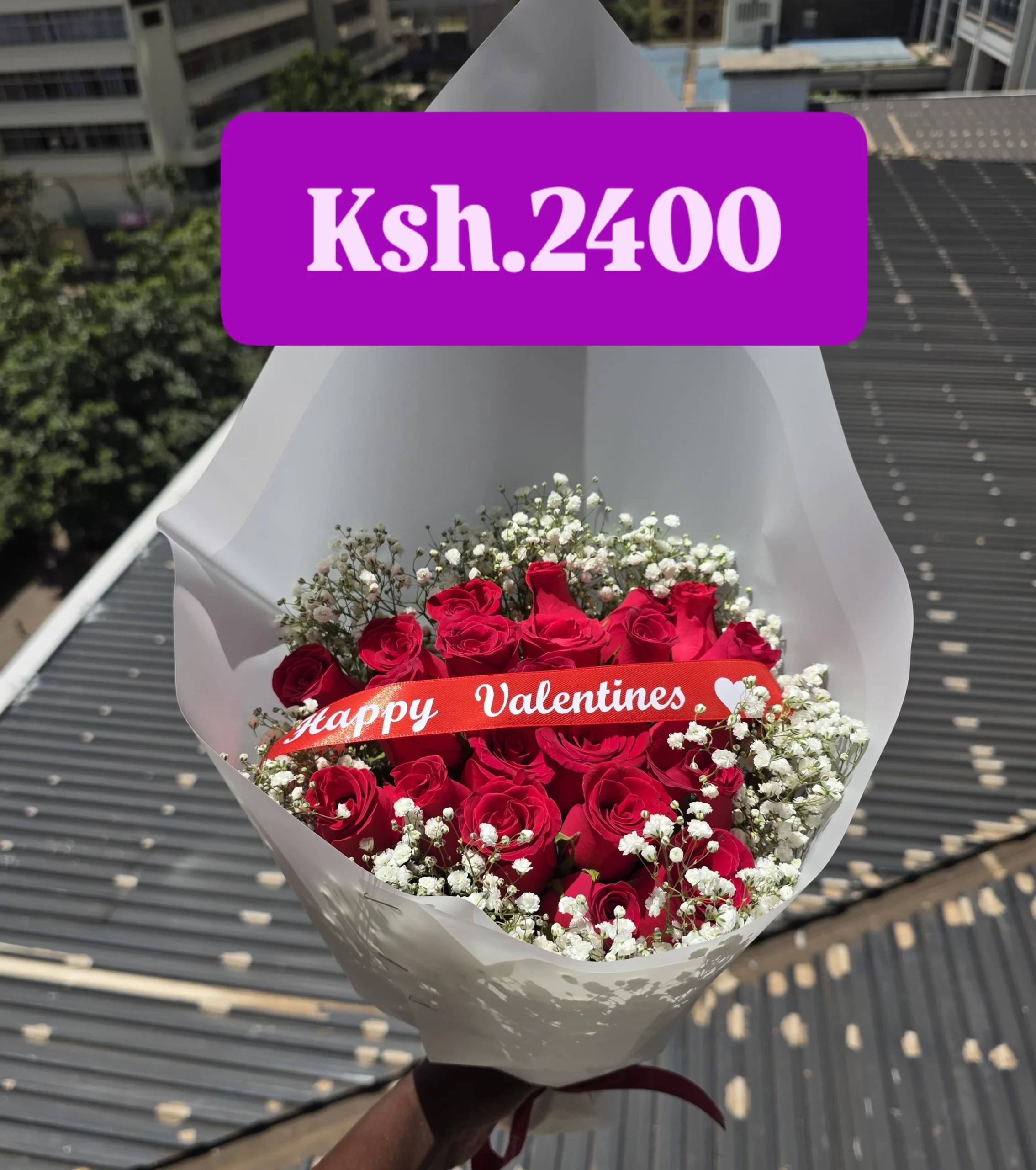 20 red roses with baby breath and a customized valentine’s day ribbon.