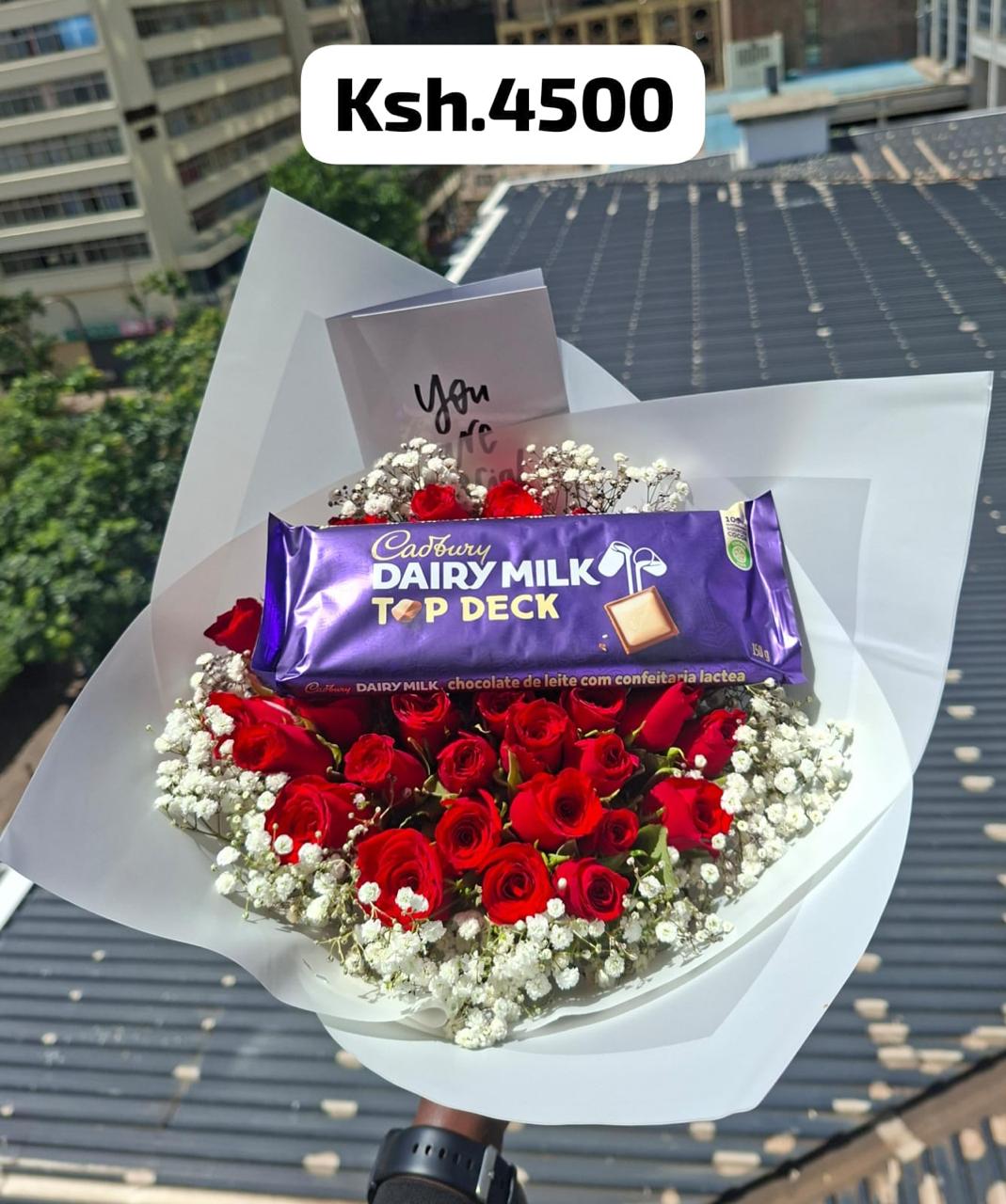 40 red roses with baby breath and a large Cadbury Chocolate. And a complimentary card.