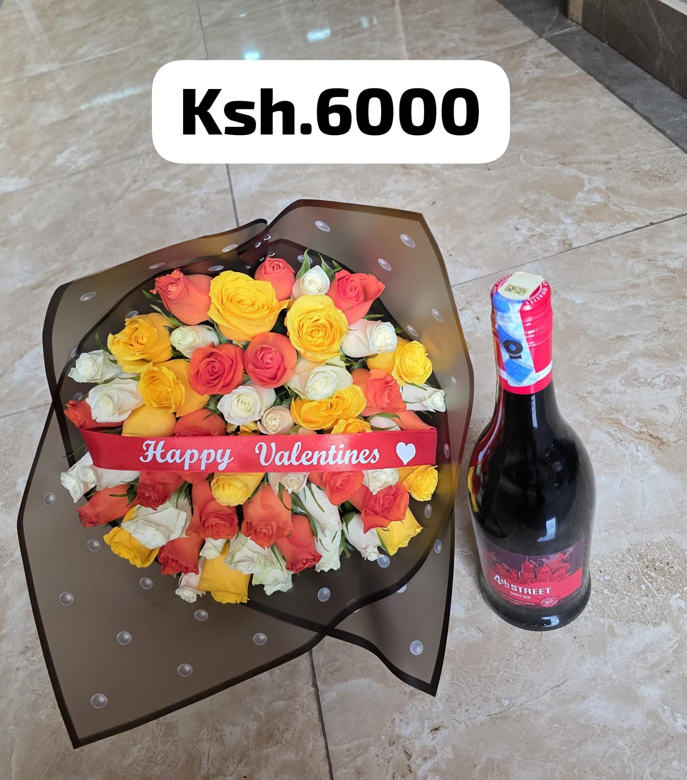Fresh mixed roses with a customized valentine’s Day ribbon, red sweet wine, and a valentine’s day card.
