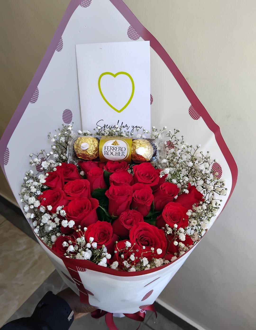Fresh flowers with chocolate. Containing 20roses with baby breath and 3pcs Ferrero Rocher Chocolates and a card.
