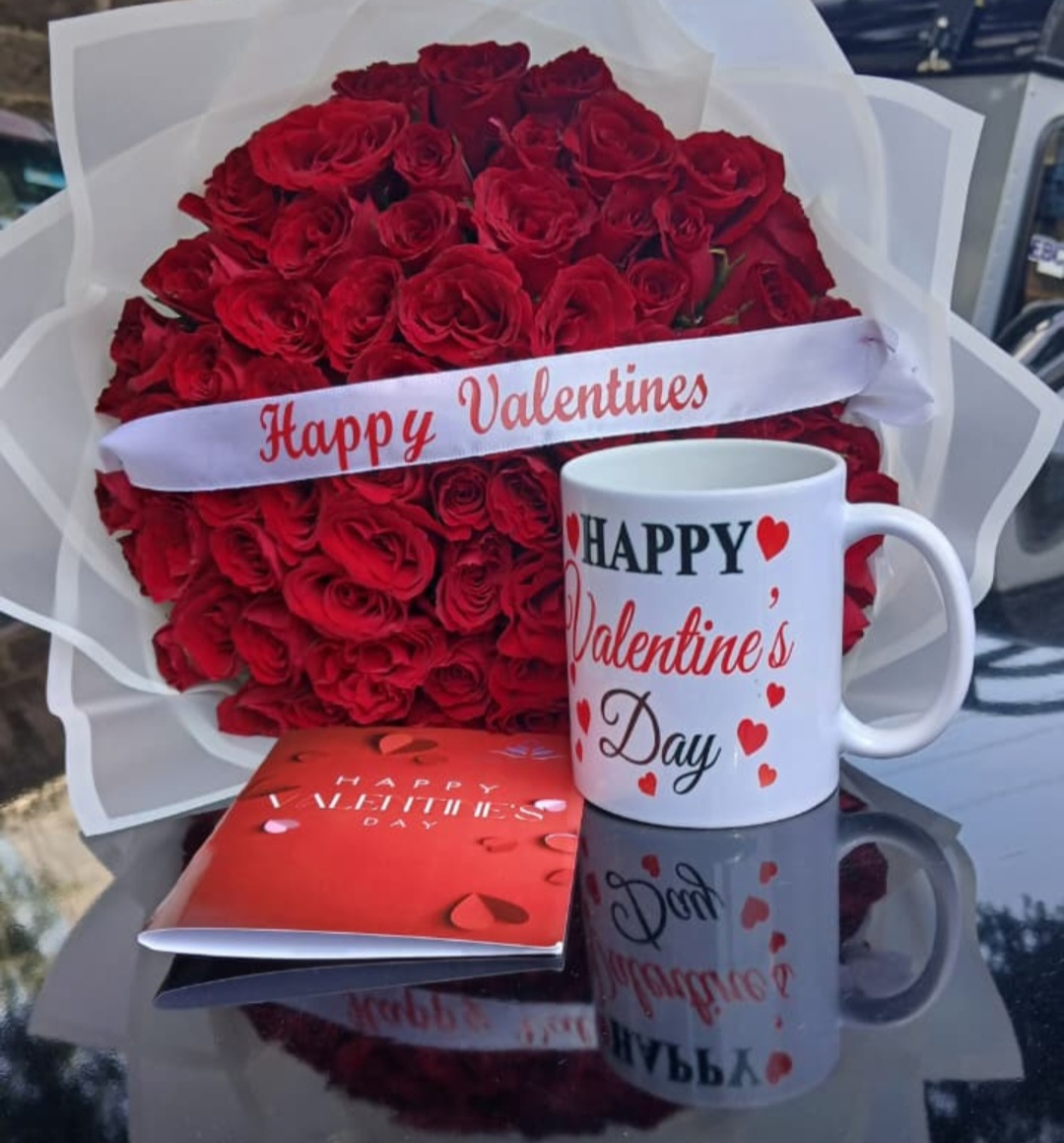 Fresh flowers, 40 red eoses witha a valentine’s ribon, valentine’s day customized mug, and a valentine’s card