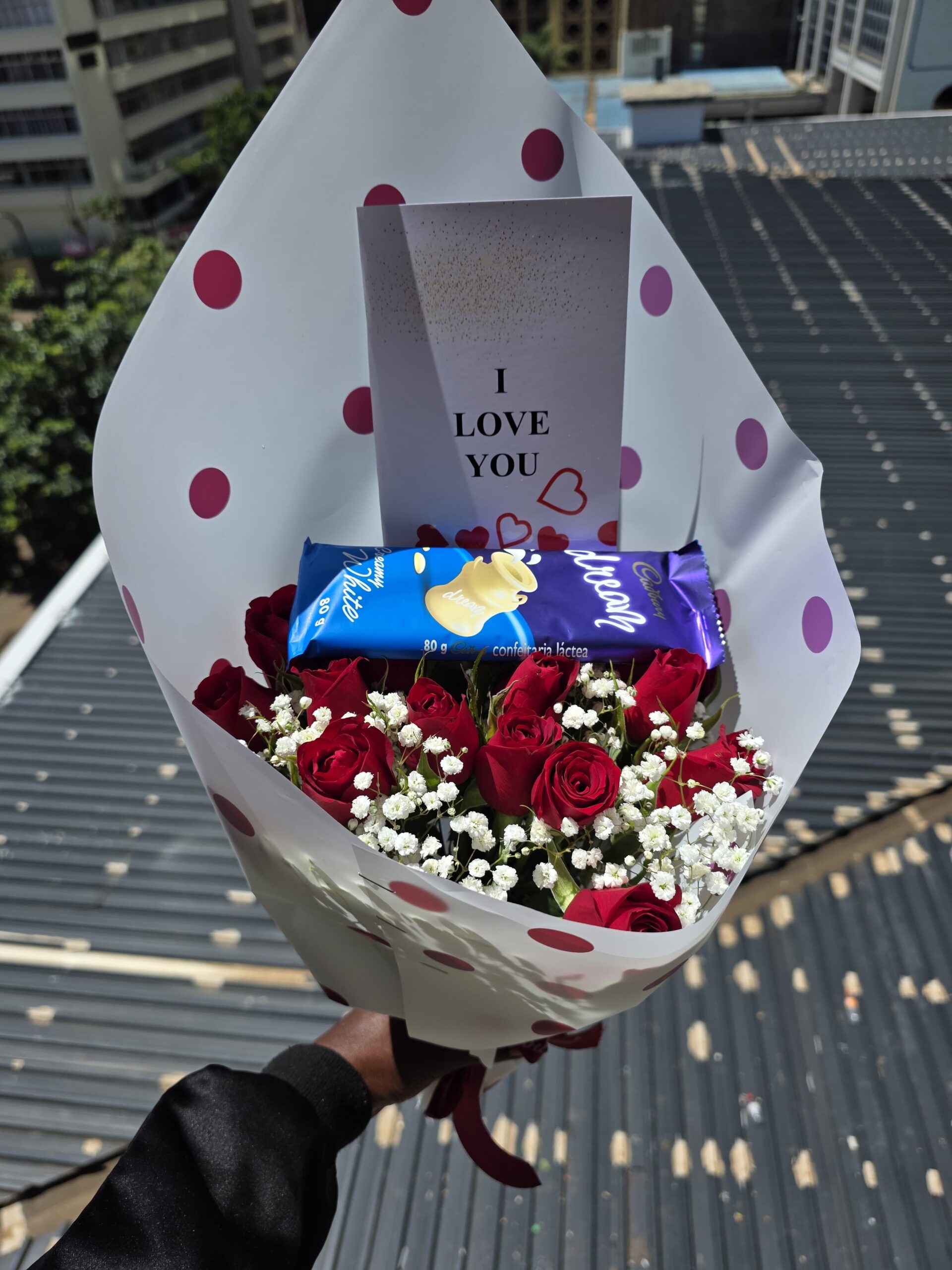 20 red roses with baby breaths, Cadbury chocolate, and a card.