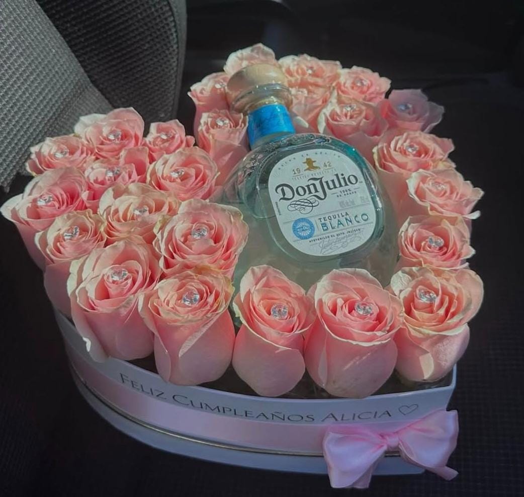 Fresh Flowers, with silver decor, Donjulio Tequila, and a card.
