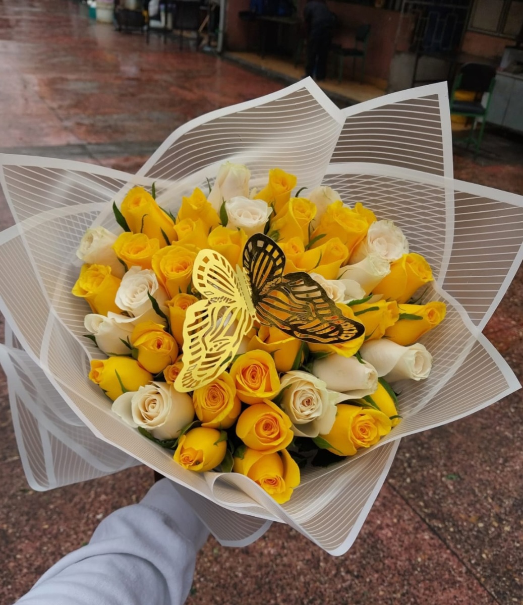 40 mixed roses. White and yellow with one butterfly decor. FREE MESSAGE CARD.