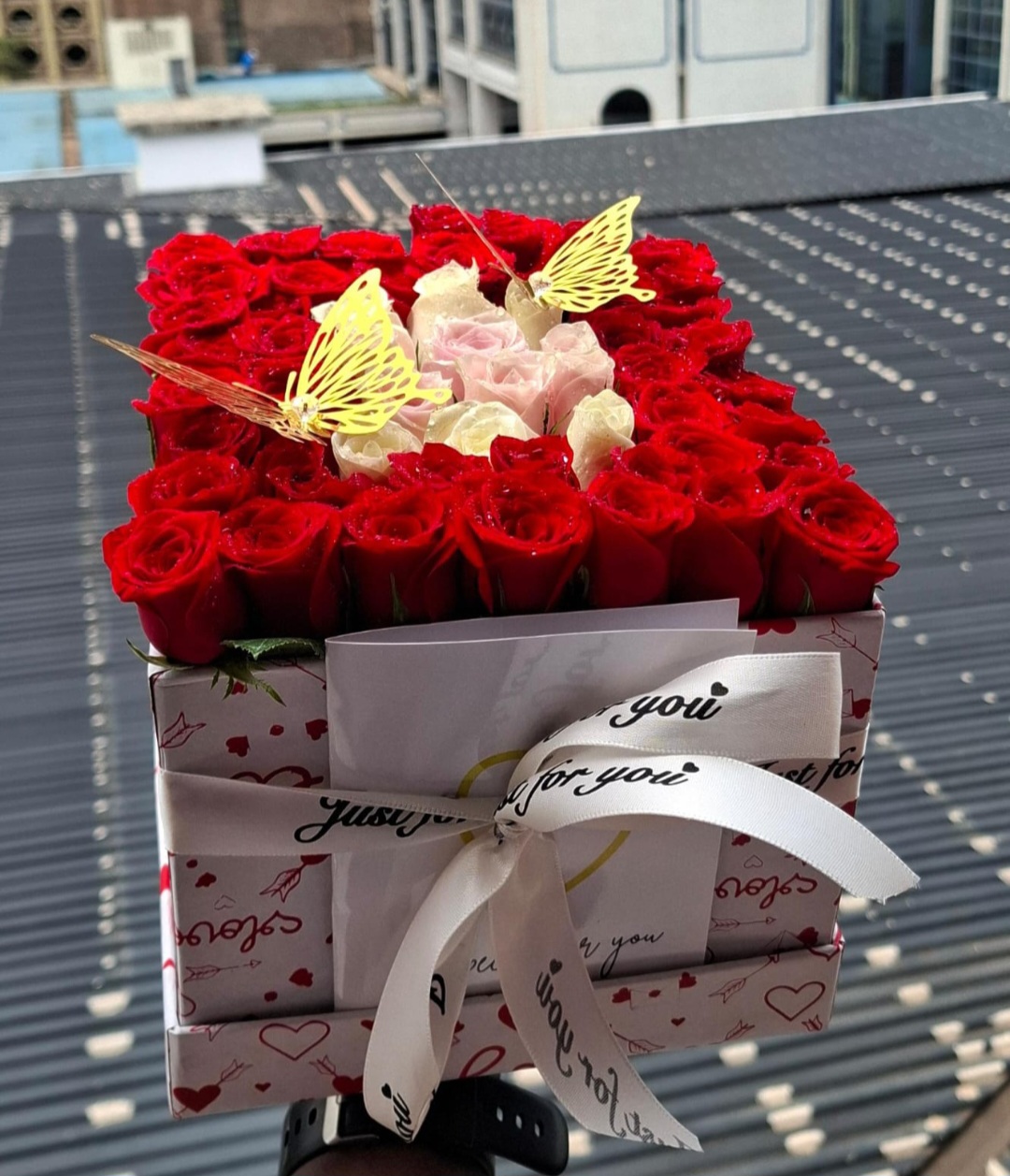 Fresh Flowers in a box. The box colour can be changed to the one that is available.
