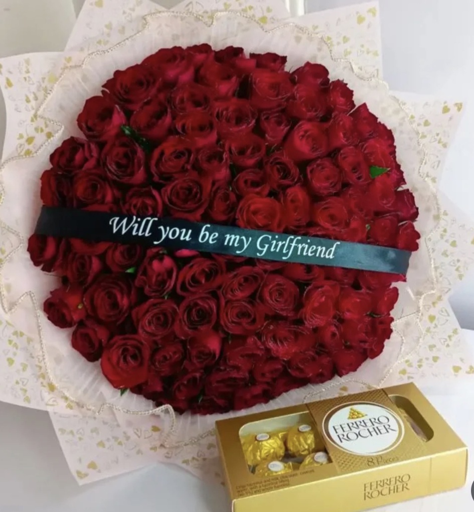 75 red roses, 8pcs ferrero rocher chocolates, and a customized ribbon.