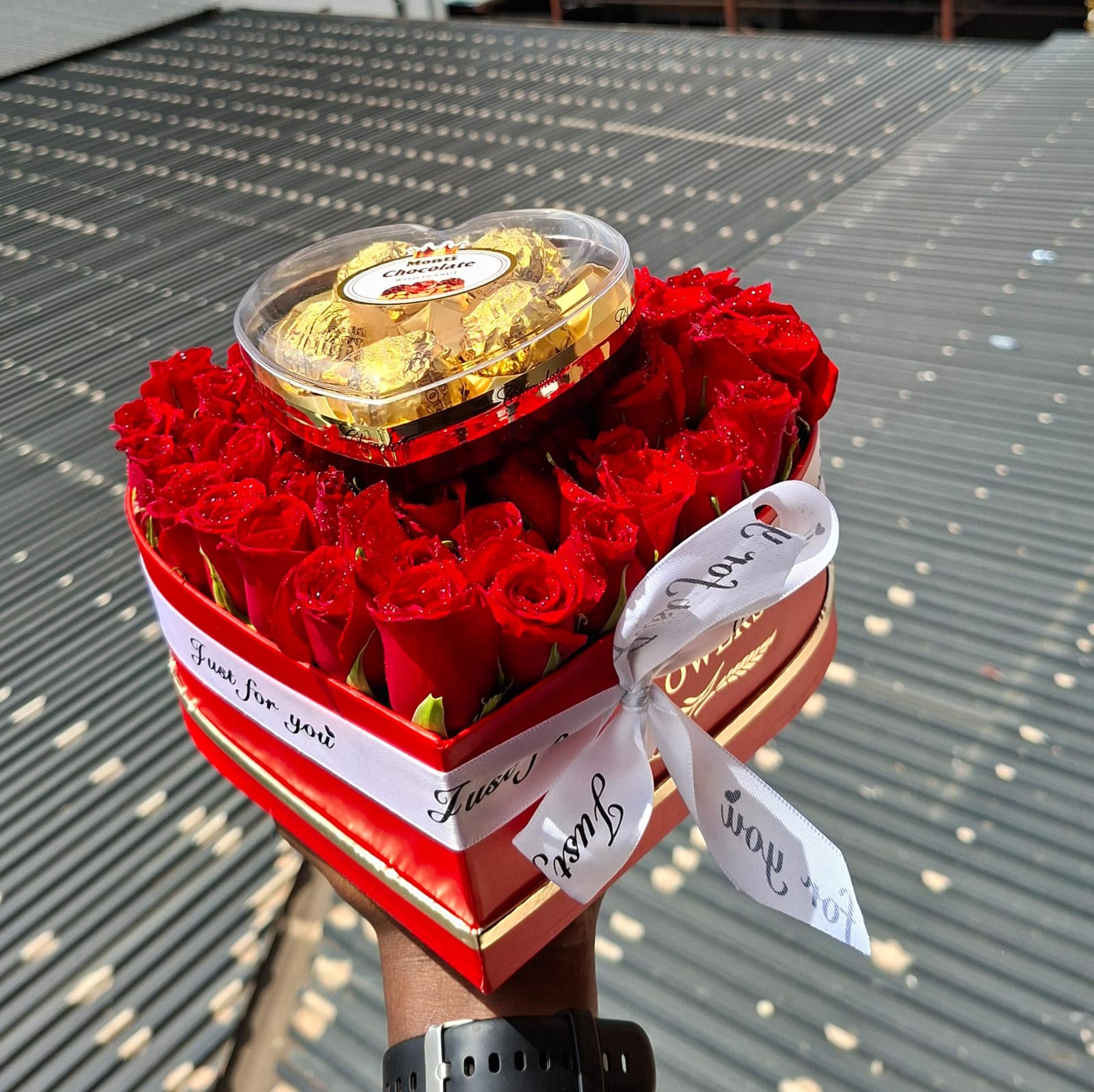 Fresh flowers in a Hatbox with golden heart-shaped chocolates.