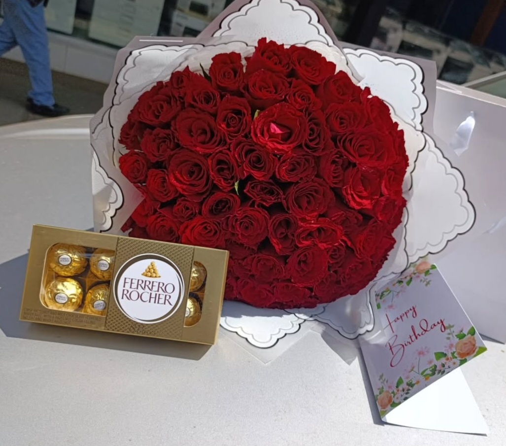 Fresh flowers bouquet of 40 red roses and 8pcs Ferrero Rocher Chocolates and a card.
