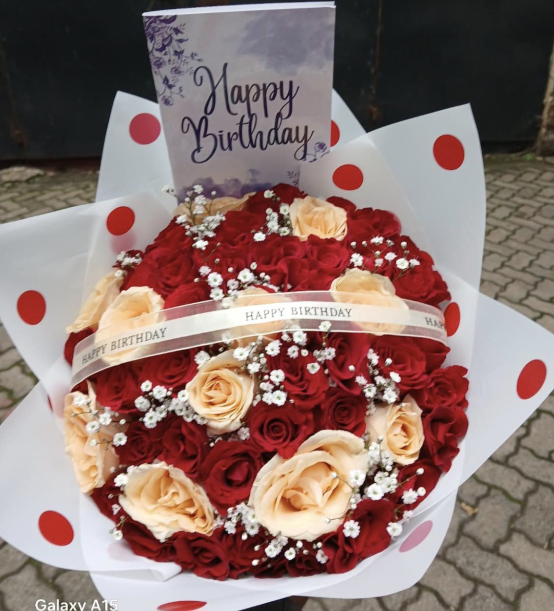 Mixed roses with baby breaths and a happy birthday ribbon and card.