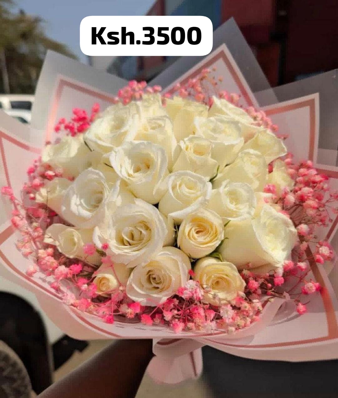 40 white roses with pink baby breaths.