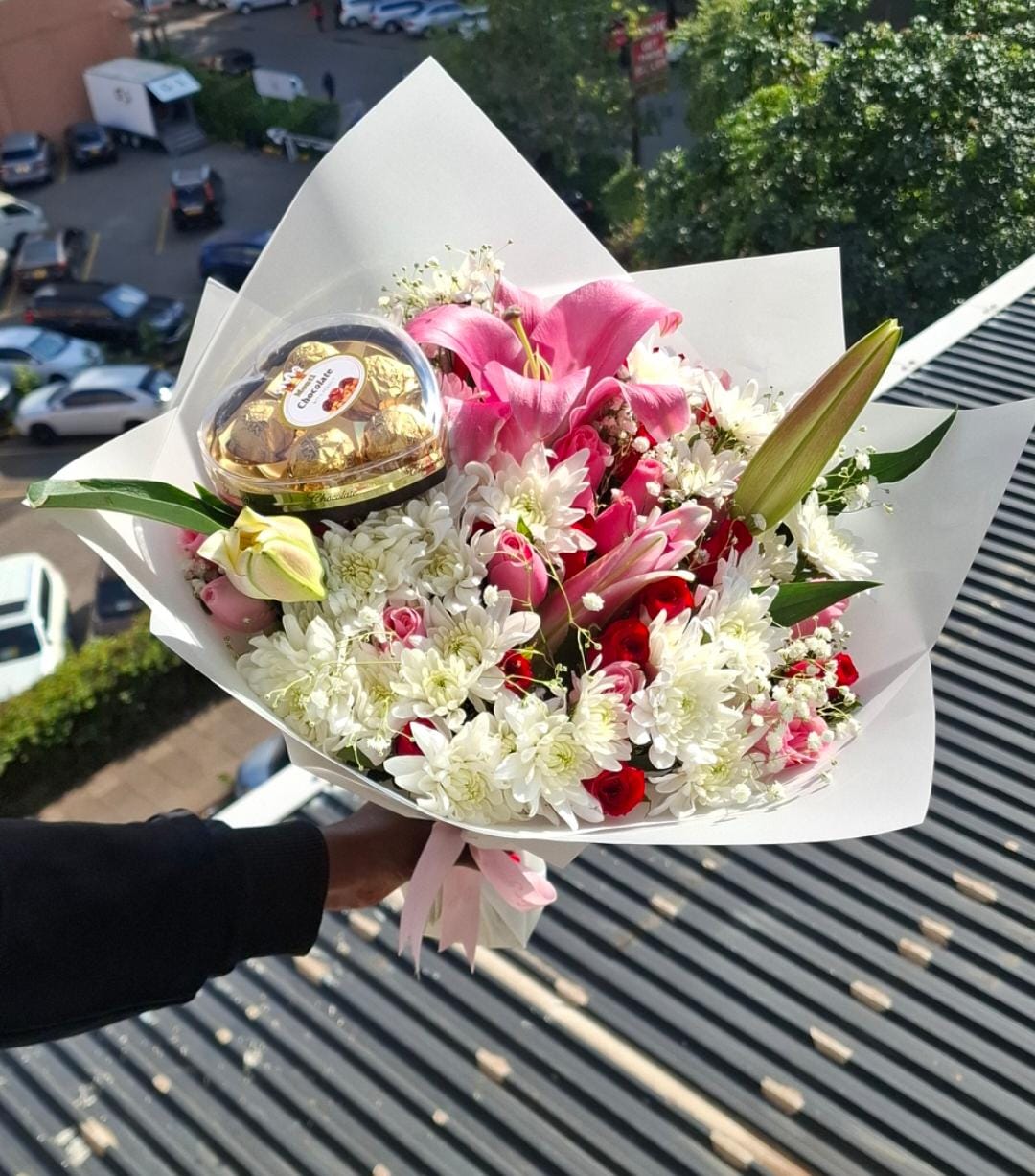 Fresh Flowers bouquet.  Chrysanthemums,  roses, and baby breaths bouquet, with a 5pcs golden heart chocolate box.