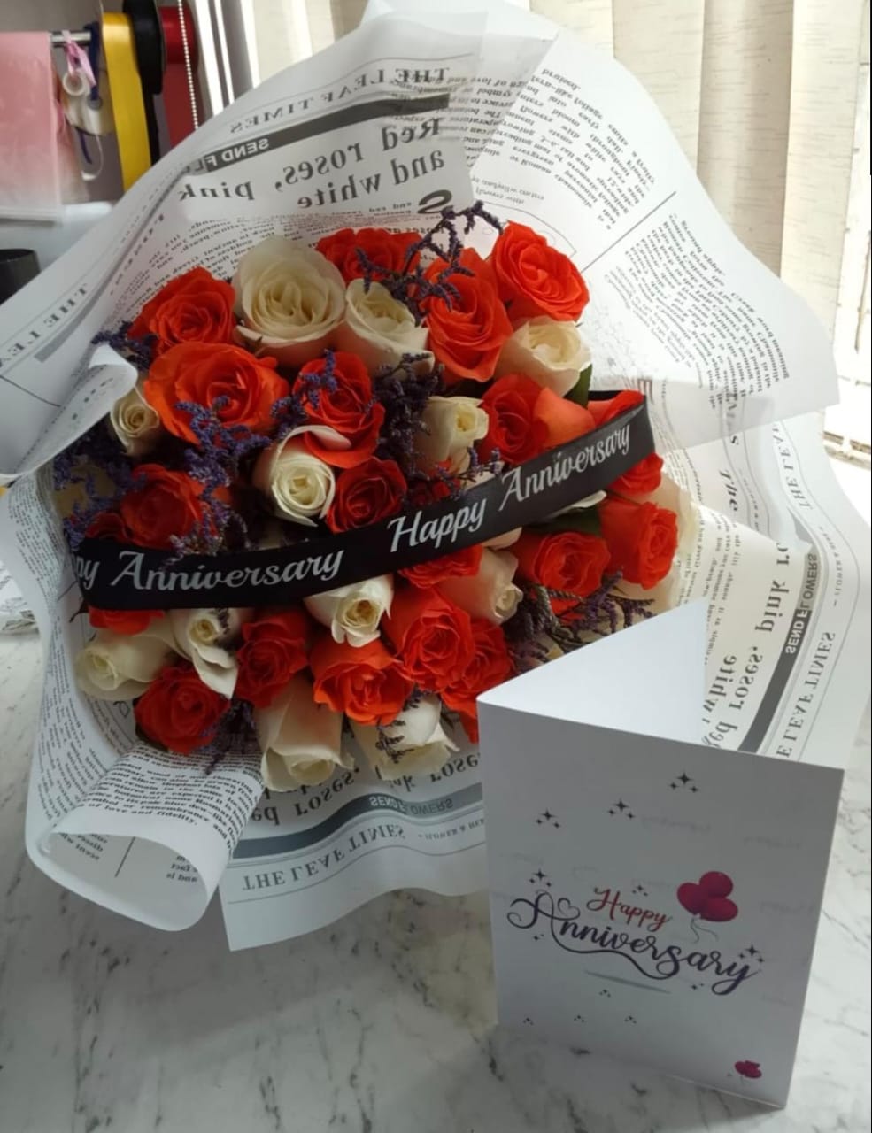 Fresh mixed roses with a customized ribbon, and a card.