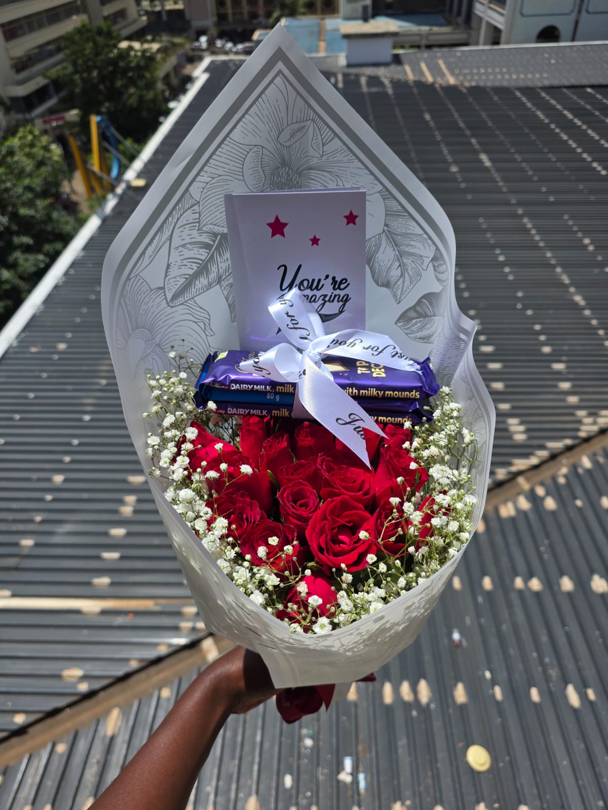 Fresh Flowers bouquet of 20 red roses and baby breaths,  and cadbury chocolates.