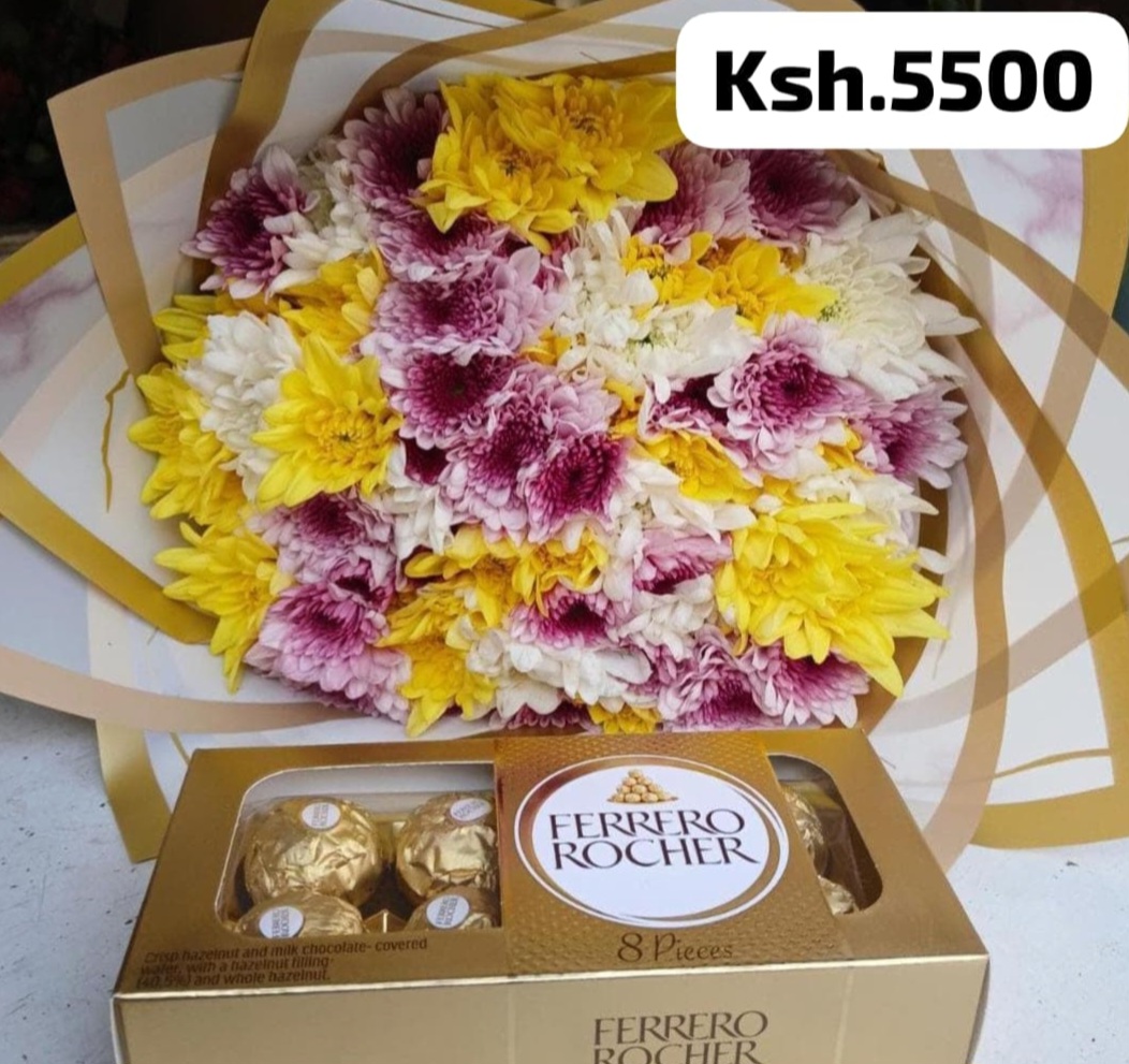 Fresh Chrysanthemums flowers with a box of golden chocolates.