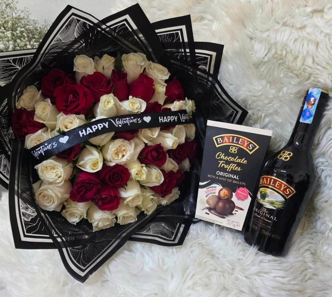 mixed two colours roses with a customized valentine’s day ribbon,  baileys chocolate tuffles, card,  and a Baileys wine.