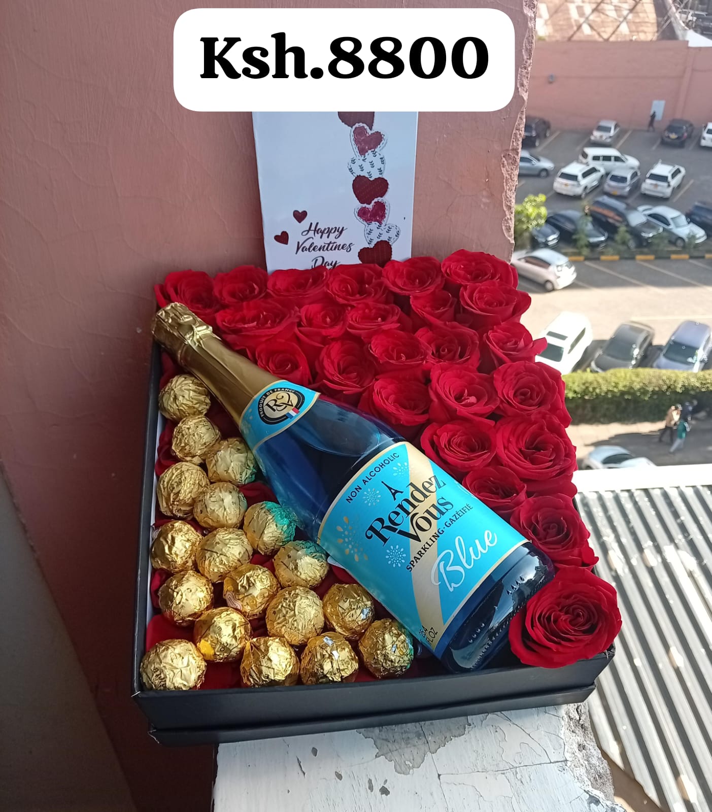 Fresh flowers in a box, non alcoholic wine, golden chocolates, and a valentine’s day Card. Valentine’s Day Gifts in Nairobi Kenya.