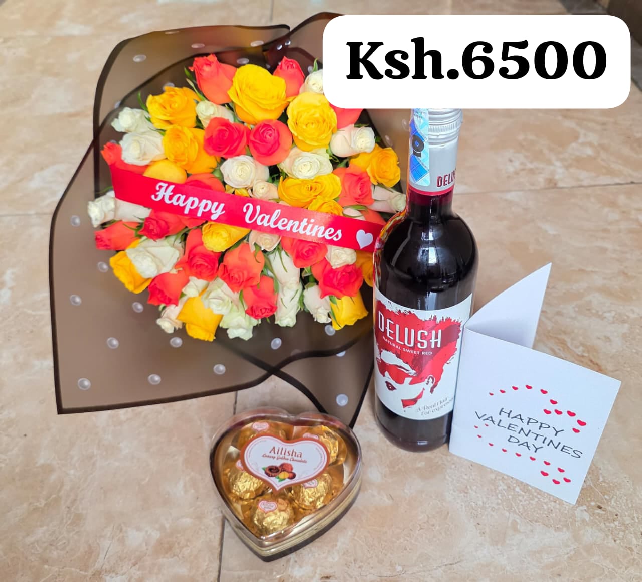 Fresh mixed roses, golden heart chocolate, sweet red wine, and a card.