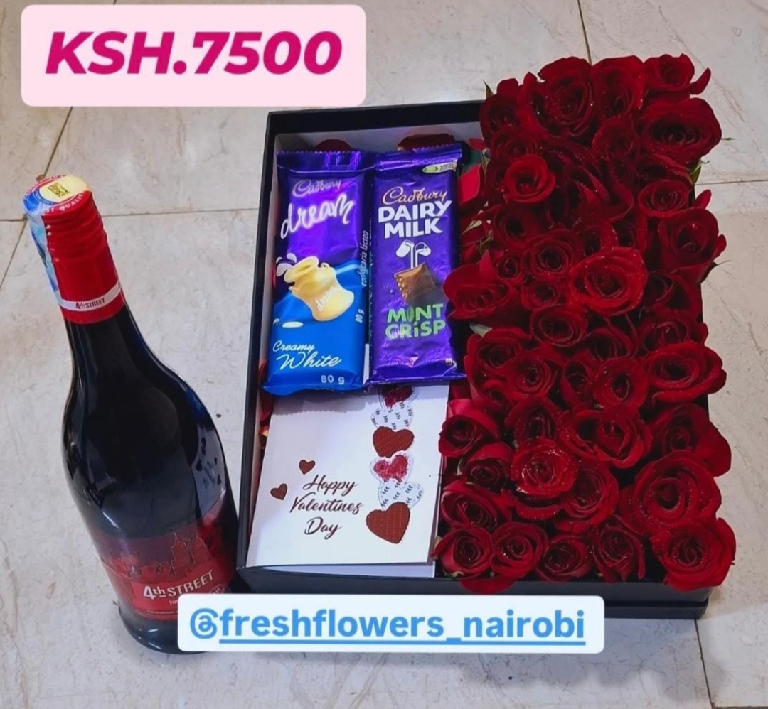 Fresh flowers in a box, swwet red wine, two Cadbury chocolates, and a valentine’s day card.