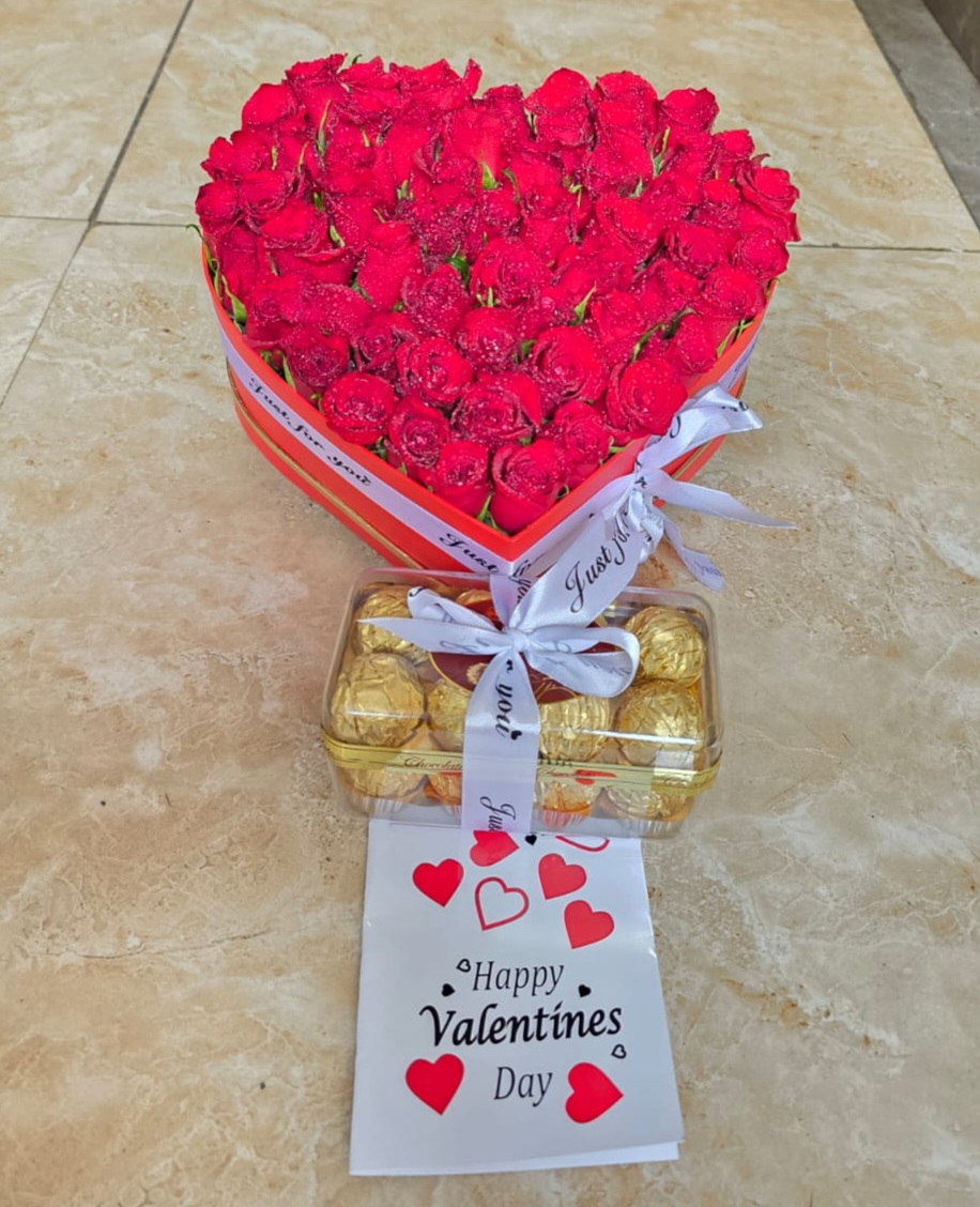 Fresh flowers in a love box, valentine’s day card, a nd a golden box chocolate.