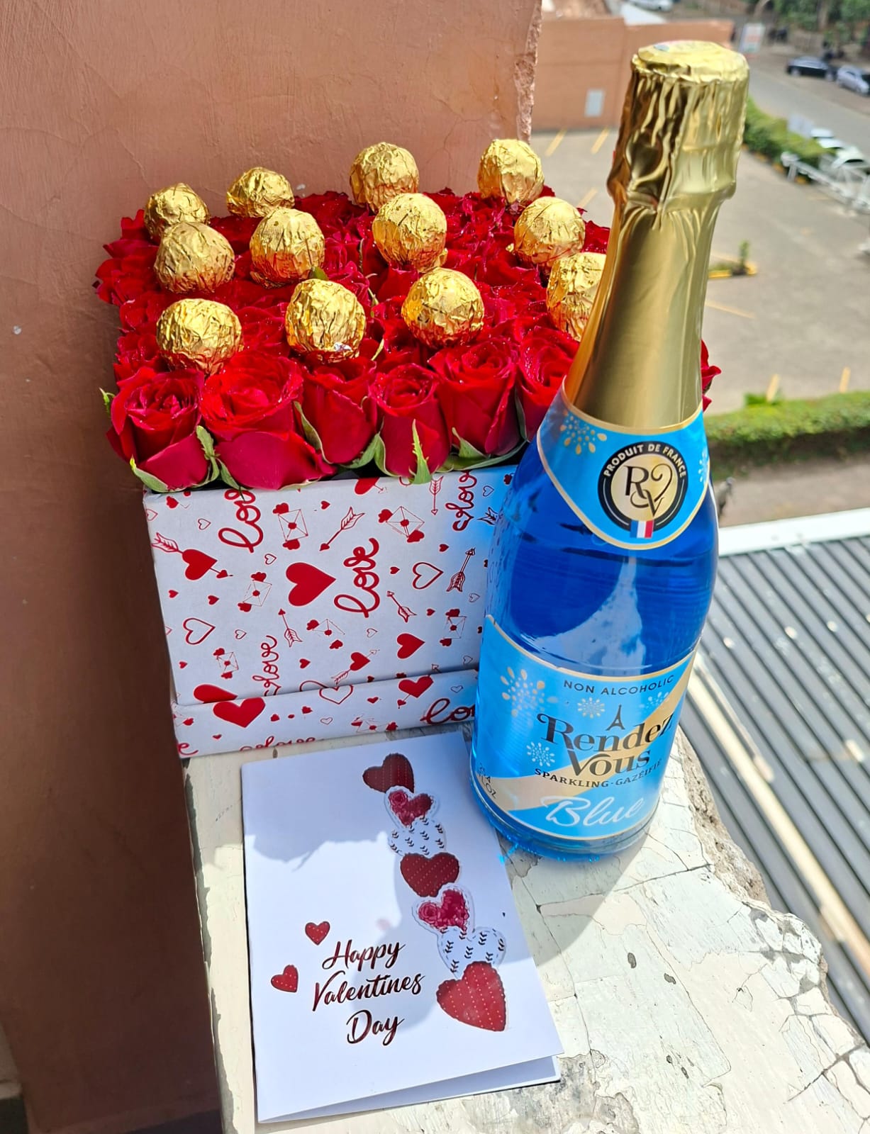 Fresh flowers in a box, golden chocolates, and a non-alcoholic wine and a valentine’s day card.